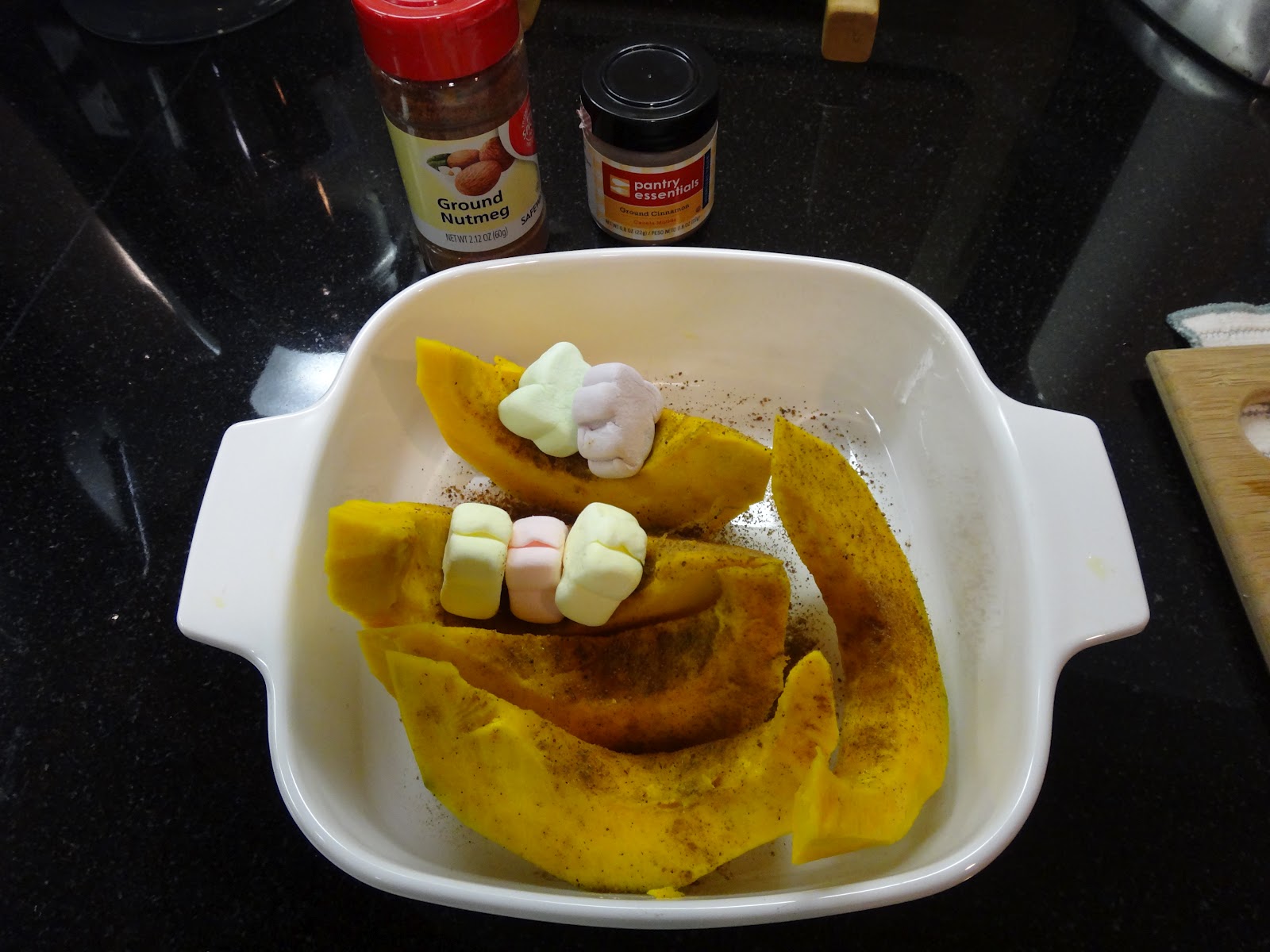 3. Set pumpkin wedges into a baking dish and sprinkle ground cinnamon and nutmeg. Add marshmallows on top (optional)
